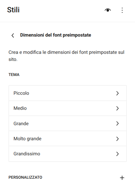 Trovi questa personalizzazione sotto Editor > Stili > Tipografia > Dimensione carattere